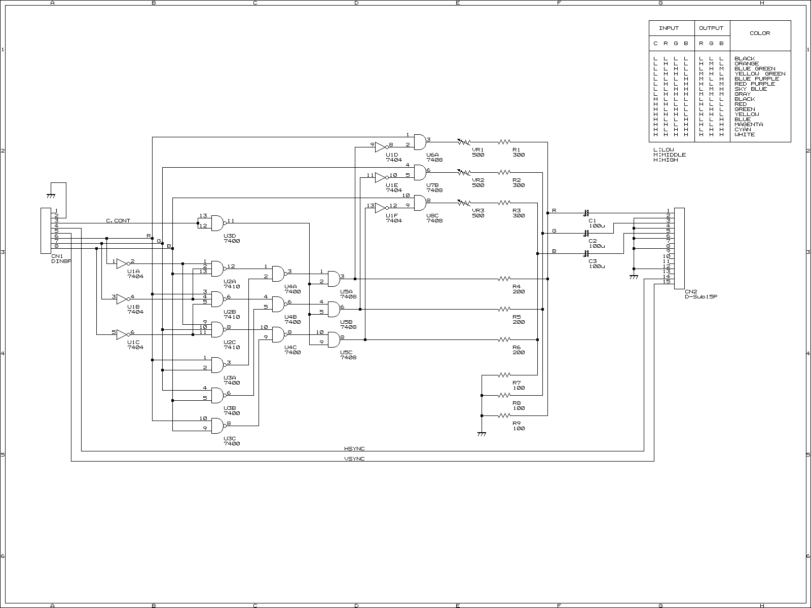 PC-6001mk2 以降の機種にはRGB出力端子が装備されています。 専用ディスプレイと組み合わせて15色表示が可能です。 が,デジタルRGBを拡張した専用規格であるため 一般的なアナログRGBディスプレイにはつなぐことが出来ません。 映ることは映るんですがデジタルRGBの8色しか出ません。 それは非常に悔しいので,コンバータを作ってみました。 適当に作った割にはちゃんと映ってるんで驚きです。<ぉぃ 15kHzに対応するアナログRGBディスプレイなら X68k用 でも FM TOWNS用 でも何でもOKなはずです。 ただし21ピンのものはダメです。(複合同期のため) 私は(かなりくたびれた)X68k用 CZ-611D を使用しています。 |